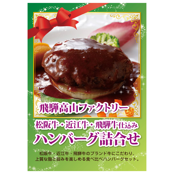 | 内容 | 松阪牛仕込みハンバーグ(150g)・近江牛仕込みハンバーグ(150g)×各2、飛騨牛仕込みハンバーグ(150g)×4 A4パネル×1 |