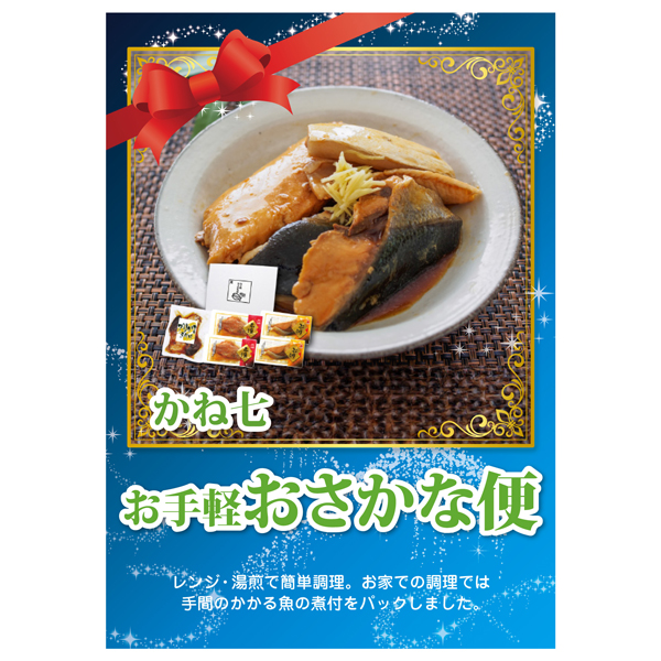 | 内容 | ブリかま煮付け(2切)×1、赤魚煮付(65g)・ぶり煮付(70g)×各2 A4パネル×1 |