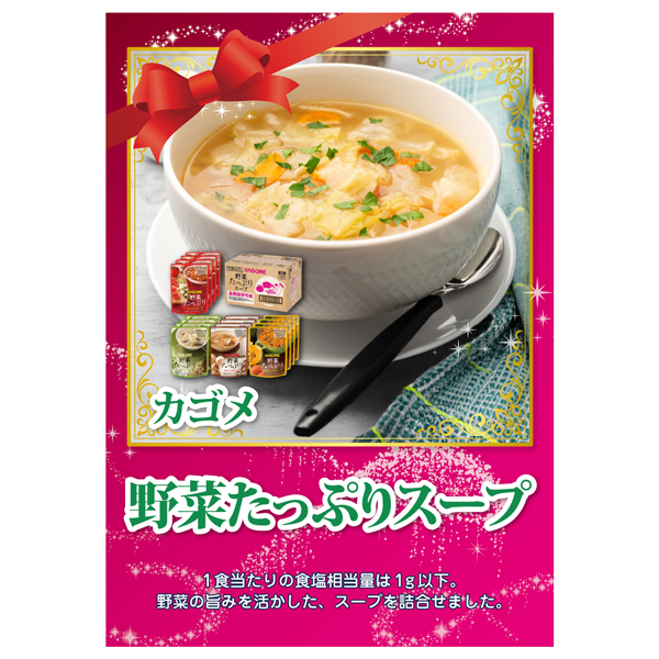 1食当たりの食塩相当量は1g以下。野菜の旨みを活かした、スープを詰合せました。
