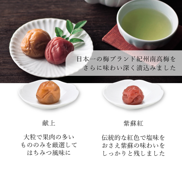 | 内容 | 献上 紀州南高梅100g×1、紫蘇紅 紀州南高梅80g×2 |