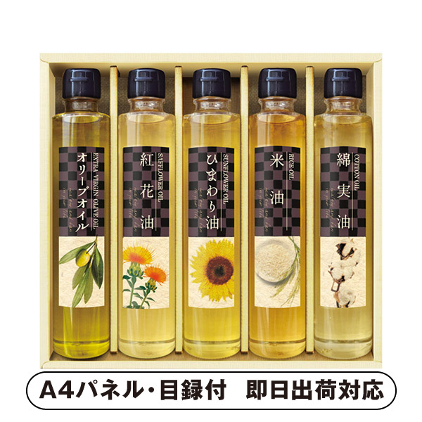 | 内容 | エクストラバージンオリーブオイル(165g)・ひまわり油(165g)・紅花油(165g)・綿実油(165g)・米油(165g)×各1 A4パネル×1 |