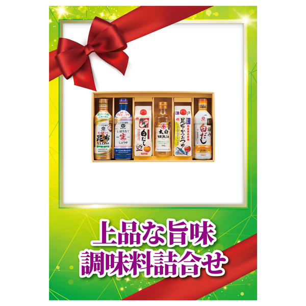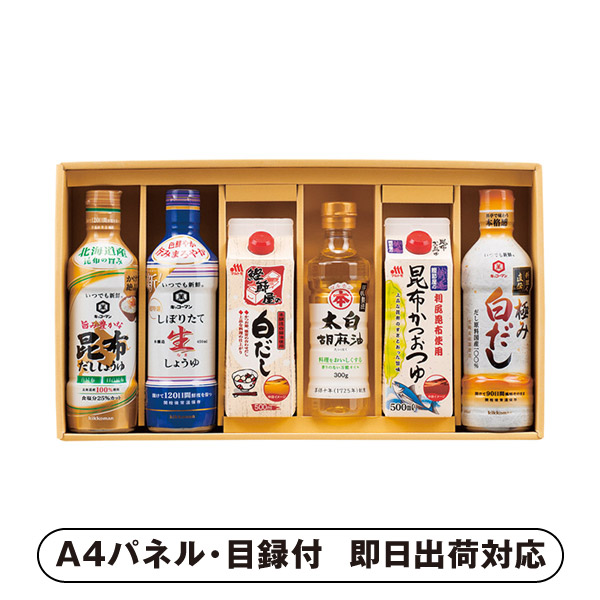 | 内容 | キッコーマンしぼりたて生しょうゆ(450ml)・キッコーマン旨み豊かな昆布だししょうゆ(450ml)・キッコーマン料理人直伝極み白だし(450ml)・マルホン太白胡麻油(300g)・マルトモ昆布かつおつゆ(500ml)・マルトモ鰹節屋の白だし(500ml)×各1 A4パネル×1 |