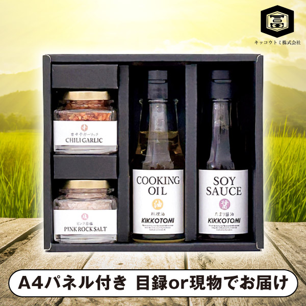 | 内容 | 唐辛子ガーリック(20g)・ピンク岩塩(45g)・クッキングオイル(60g)・たまり醤油(70ml)×各1 A4パネル×1 |