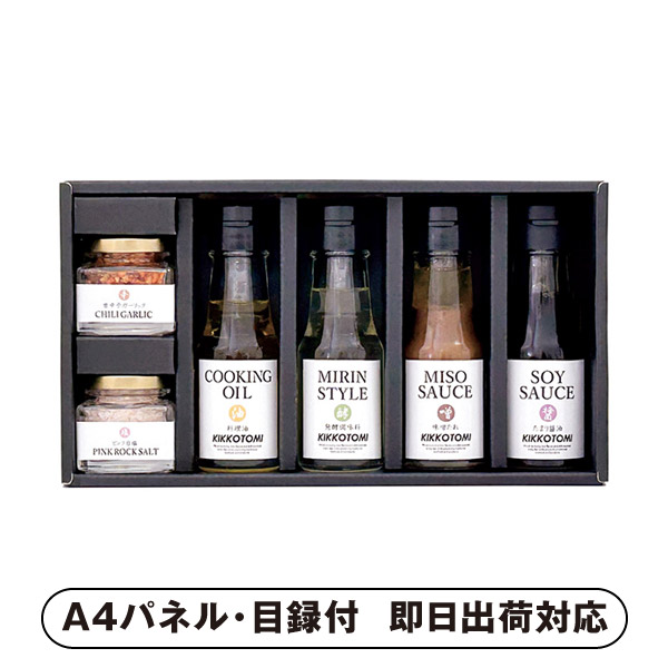 | 内容 | 唐辛子ガーリック(20g)・ピンク岩塩(45g)・クッキングオイル(60g)・みりん風発酵調味料(70ml)・味噌たれ(70ml)・たまり醤油(70ml)×各1 A4パネル×1 |