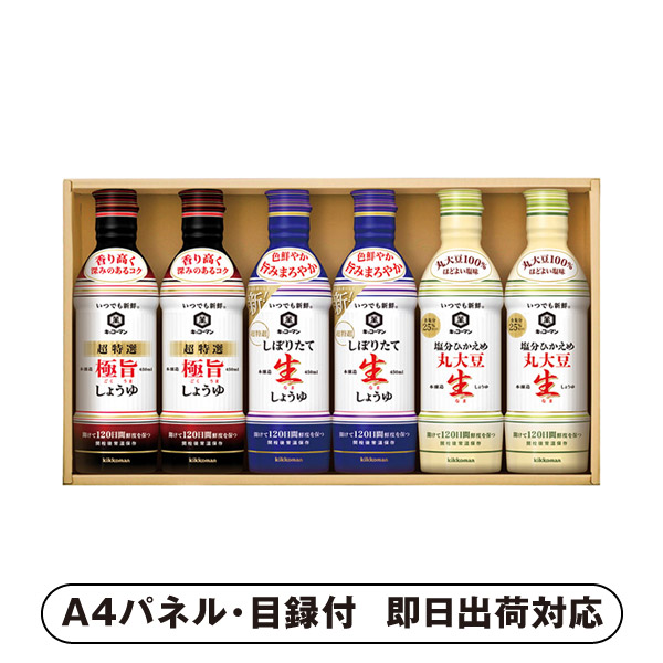 | 内容 | しぼりたて生しょうゆ(450ml)・超特選極旨しょうゆ(450ml)・塩分ひかえめ丸大豆生しょうゆ(450ml)×各2 A4パネル×1 |