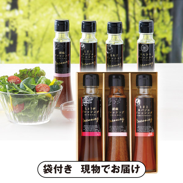 | 内容 | しょうがドレッシング(100ml)・胡麻ドレッシング(100ml)・とまと&バジルドレッシング(100ml)×各1 |
