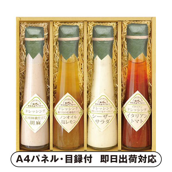 | 内容 | 信州林檎仕立て胡麻ドレッシング(120ml)・2種のイタリア産チーズ仕立てシーザーサラダドレッシング(120ml)・瀬戸内の花藻塩仕立てノンオイル塩レモンドレッシング(120ml)・イタリアントマトのイタリアンドレッシング(120ml)×各1 A4パネル×1 |