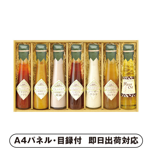 | 内容 | 信州林檎仕立て胡麻ドレッシング(120ml)・2種のイタリア産チーズ仕立てシーザーサラダドレッシング(120ml)・瀬戸内の花藻塩仕立てノンオイル塩レモンドレッシング(120ml)・イタリアントマトのイタリアンドレッシング(120ml)・特選醤油仕立てノンオイル白だしドレッシング(120ml)・甘味噌仕立て木の実ドレッシング(120ml)・米油(110g)×各1 A4パネル×1 |