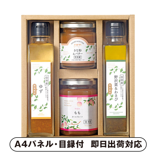 | 内容 | ももスプレッド(140g)・きな粉&バターペースト(110g)・ゆずドレッシング(150ml)・野沢菜&わさびドレッシング(150ml)×各1 A4パネル×1 |
