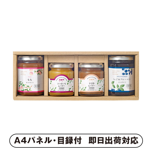 | 内容 | ももスプレッド(140g)・りんご&ブルーベリースプレッド(140g)・さつまいも&バターペースト(110g)・きな粉&バターペースト(110g)×各1 A4パネル×1 |