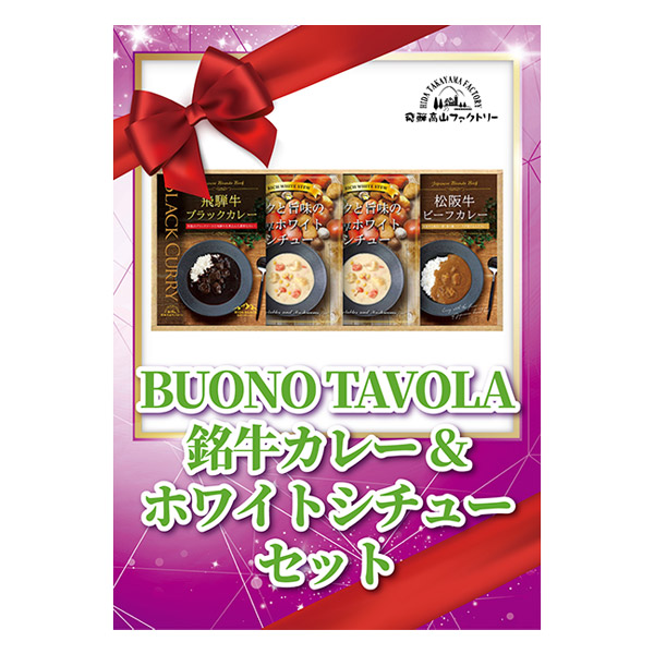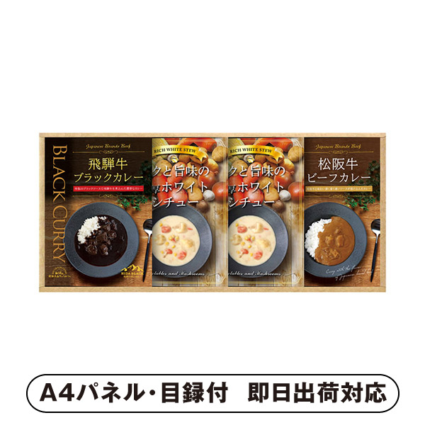 | 内容 | 松阪牛ビーフカレー(180g)・飛騨牛ブラックカレー(190g)×各1、ホワイトシチュー(180g)×2 A4パネル×1 |