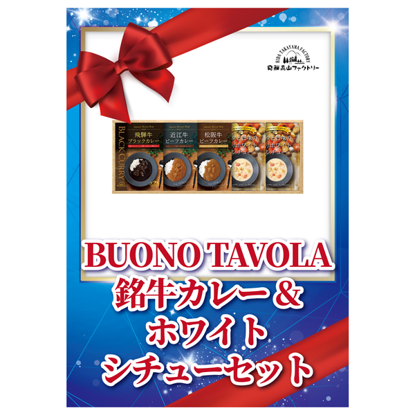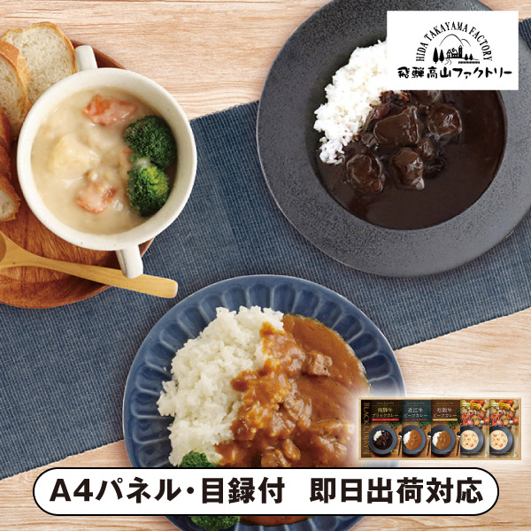 | 内容 | 松阪牛ビーフカレー(180g)・飛騨牛ブラックカレー(190g)・近江牛ビーフカレー(180g)×各1、ホワイトシチュー(180g)×2 A4パネル×1 |