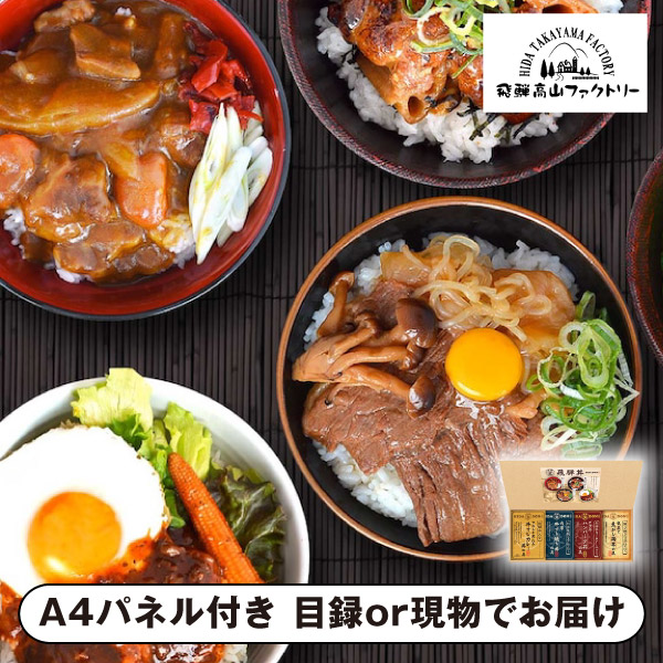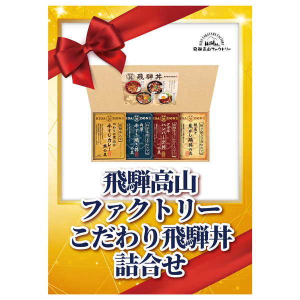 | 内容 | 飛騨牛仕込み牛すじカレー丼の具(180g)・照り焼きマヨ仕立て根菜と焦がし鶏丼の具(160g)・料亭風割り下仕立て牛すき焼き丼の具(170g)・飛騨牛ミートソース仕立てWハンバーグ丼の具(180g)×各1 A4パネル×1 |