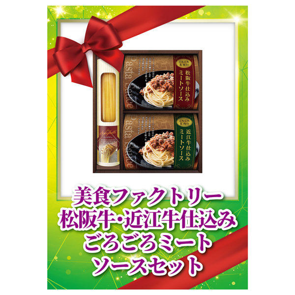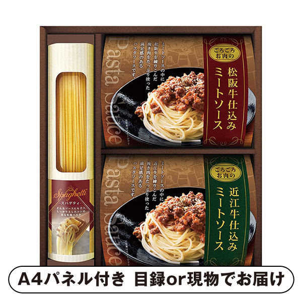 | 内容 | スパゲティ(100g)・松阪牛仕込みごろごろミートソース(150g)・近江牛仕込みごろごろミートソース(150g)×各1 A4パネル×1 |