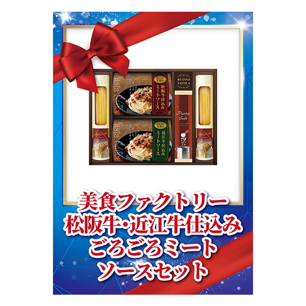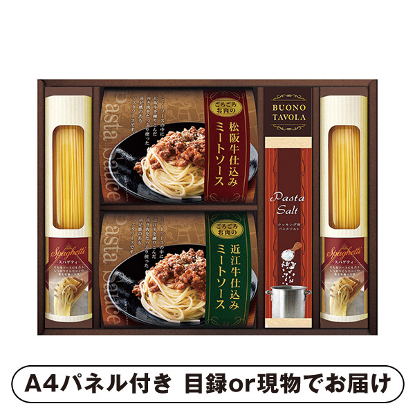 | 内容 | スパゲティ(100g)×2、松阪牛仕込みごろごろミートソース(150g)・近江牛仕込みごろごろミートソース(150g)・パスタソルト(100g)×各1 A4パネル×1 |