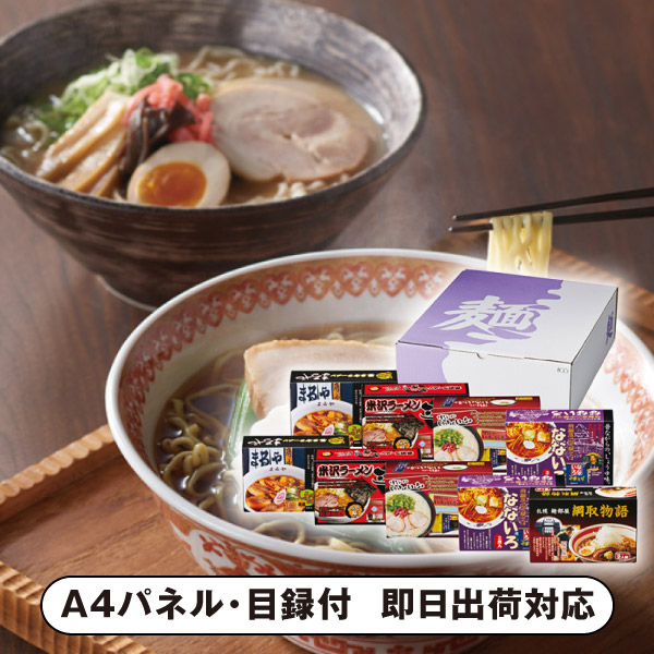 | 内容 | 喜多方ラーメン「まるや」醤油味(2食入)(220g)・米沢ラーメン「三男坊」味噌味(2食入)(268g)・博多ラーメン「いっちょいっちょ」豚骨味(2食入)(230g)・飛騨高山中華そば「なないろ」(2食入)(250g)×各2、北海道札幌ラーメン「綱取物語」味噌味(2食入)(288g)×1 A4パネル×1 |