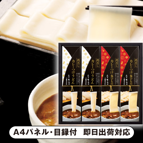 | 内容 | カレーつけうどん(うどん:90g・カレーつゆ:180g)・カレーつけ鬼ひも川(鬼ひも川:90g・カレーつゆ:180g)×各2 A4パネル×1 |