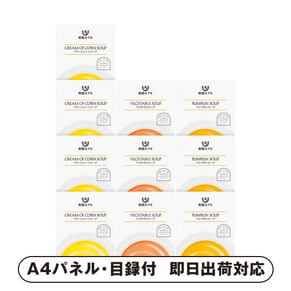 | 内容 | クリームコーンスープ(160g)×4、ベジタブルスープ(160g)・パンプキンスープ(160g)×各3 A4パネル×1 |