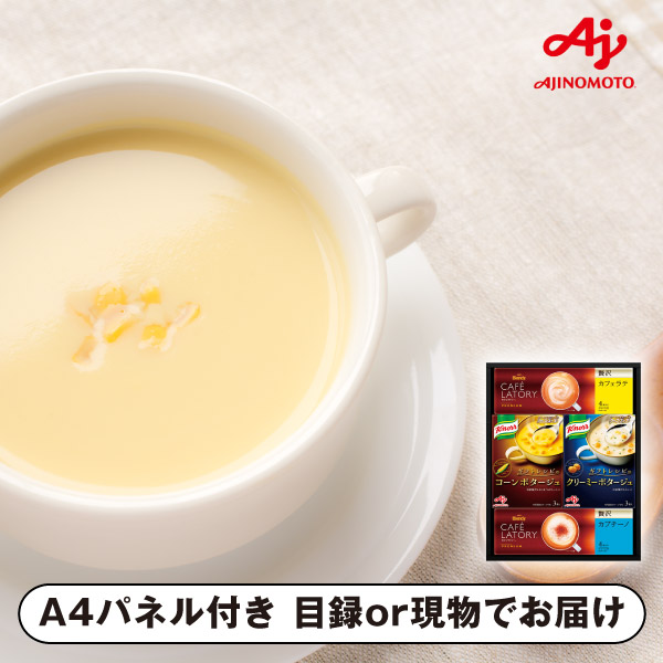 | 内容 | コーンポタージュ(3袋入)・クリーミーポタージュ(3袋入)・スティックプレミアム贅沢カフェラテ(4P)・スティックプレミアム贅沢カプチーノ(4P)×各1 A4パネル×1 |