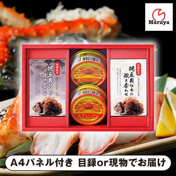 紅ずわいがに缶と帆立貝ひも炊き合わせを詰めたセット。どんな料理とも相性抜群で、使い勝手の良いかに缶はストックもでき大変便利です。風味豊かな海の幸を手軽に楽しめる、心温まる贅沢なギフトです。