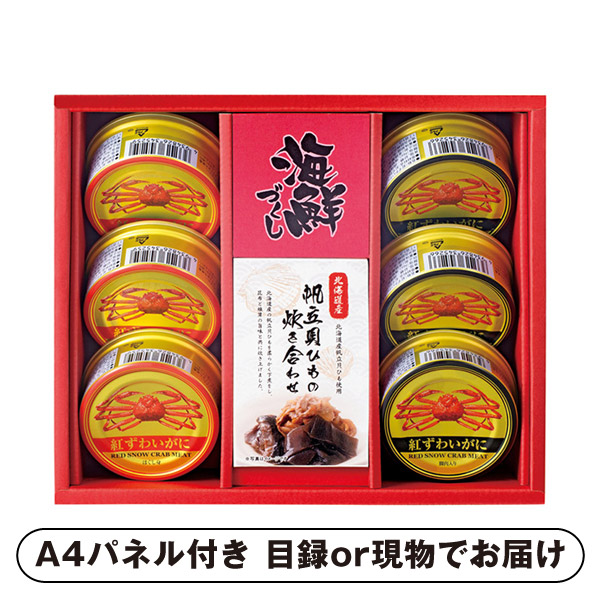 | 内容 | 紅ずわいがに(ほぐし身)(55g)・紅ずわいがに(脚肉入り)(55g)×各3、帆立貝ひもの炊き合わせ(50g)×1 A4パネル×1 |