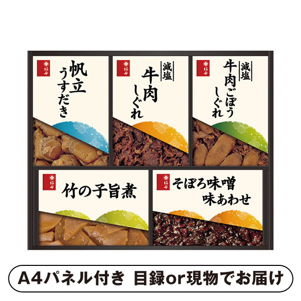 | 内容 | 減塩牛肉しぐれ(50g)・減塩牛肉ごぼうしぐれ(50g)・帆立うすだき(40g)・竹の子旨煮(50g)・そぼろ味噌味あわせ(90g)×各1 A4パネル×1 |
