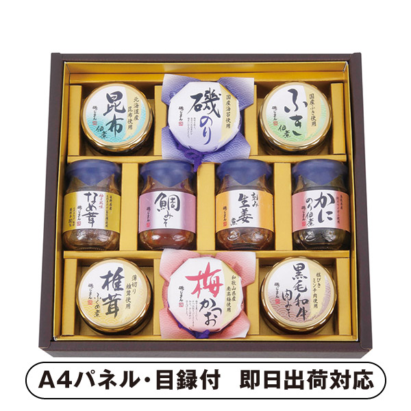 | 内容 | 昆布佃煮(70g)・磯のり(90g)・ふき佃煮(50g)・椎茸ふくめ煮(85g)・梅かつお(90g)・黒毛和牛肉みそ(90g)・柚子風味なめ茸(85g)・鯛みそ(100g)・刻み生姜煮(90g)・かにのり佃煮(90g)×各1 A4パネル×1 |