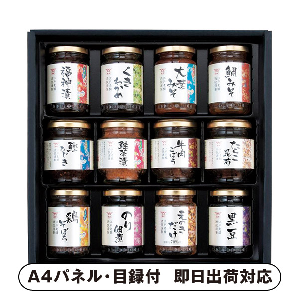 | 内容 | 福神漬(90g)・くきわかめ(75g)・のり佃煮(95g)・鮭茶漬(60g)・鯛みそ(100g)・黒豆(100g)・えのきだけ(90g)・牛肉ごぼう(55g)・鰹ひじき(40g)・大葉みそ(100g)・鶏そぼろ(50g)・たらこ昆布(50g)×各1 A4パネル×1 |