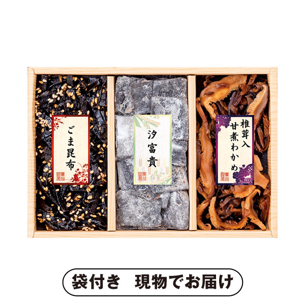 | 内容 | ごま昆布(45g)・汐富貴(20g)・椎茸入甘煮わかめ(45g)×各1 |