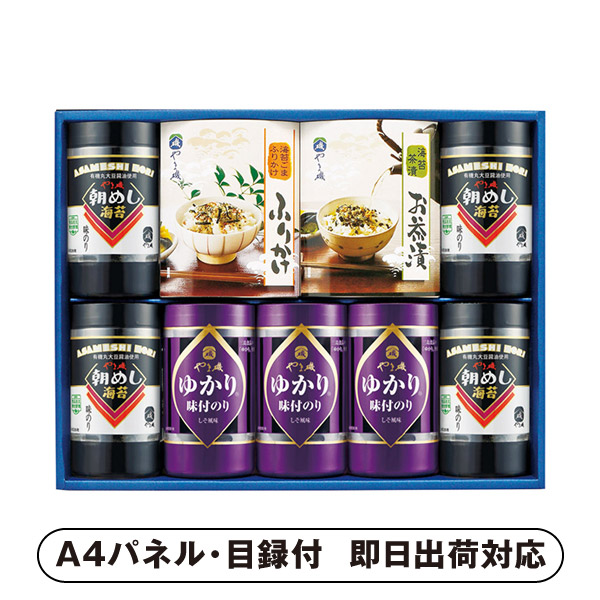| 内容 | 味付のり(8切26枚)×4、しそ風味のり(8切26枚)×3、のり茶漬け(5.5g×4袋)・のりふりかけ(5g×4袋)×各1 A4パネル×1 |