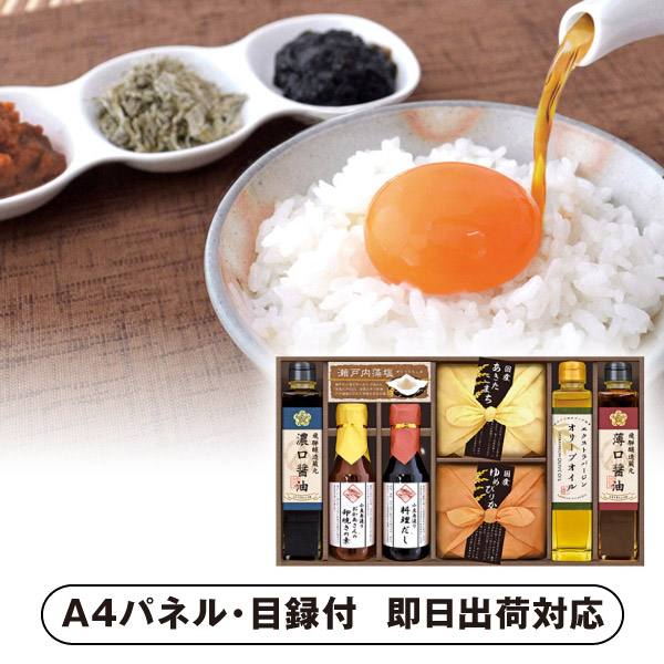 | 内容 | 国産あきたこまち(300g)・国産ゆめぴりか(300g)・小豆島造り料理だし(150ml)・小豆島造り卵焼きの素(150ml)・飛騨高山濃口醤油(200ml)・飛騨高山薄口醤油(200ml)・エクストラバージンオリーブオイル(165g)・瀬戸内藻塩(80g)×各1 A4パネル×1 |