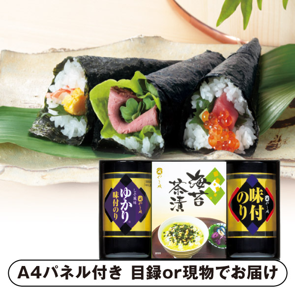 | 内容 | 味付のり(8切24枚)・しそ風味のり(8切24枚)・海苔茶漬け(5.5g×3)×各1 A4パネル×1 |