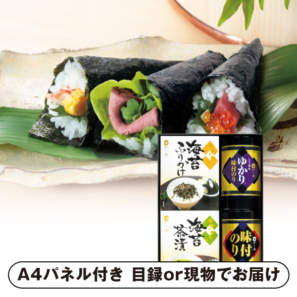| 内容 | 味付のり(8切24枚)・しそ風味のり(8切24枚)・海苔茶漬け(5.5g×3)・海苔ふりかけ(5g×3)×各1 A4パネル×1 |