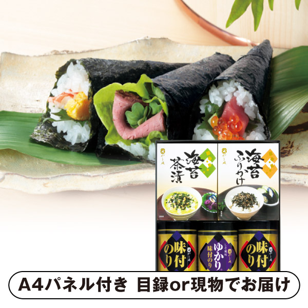 | 内容 | 味付のり(8切24枚)×2、しそ風味のり(8切24枚)・海苔茶漬け(5.5g×3)・海苔ふりかけ(5g×3)×各1 A4パネル×1 |