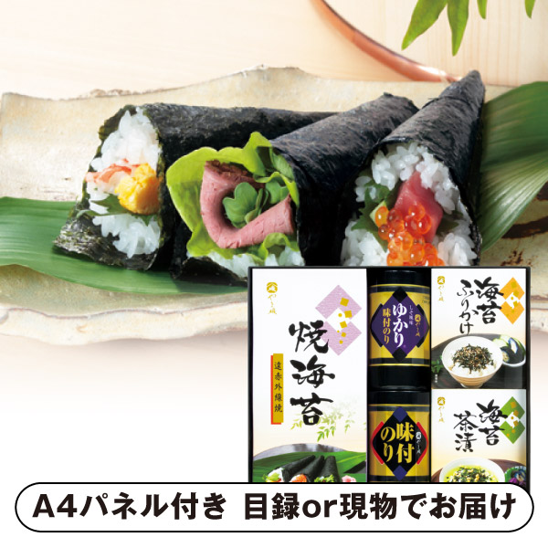 | 内容 | 味付のり(8切24枚)・しそ風味のり(8切24枚)・焼のり2袋詰(2切6枚)・海苔茶漬け(5.5g×3)・海苔ふりかけ(5g×3)×各1 A4パネル×1 |