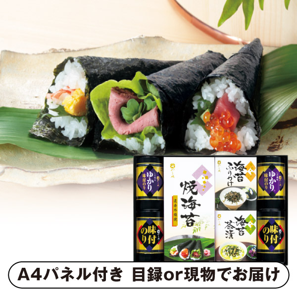 | 内容 | 味付のり(8切24枚)・しそ風味のり(8切24枚)×各2、焼のり2袋詰(2切6枚)・海苔茶漬け(5.5g×3)・海苔ふりかけ(5g×3)×各1 A4パネル×1 |