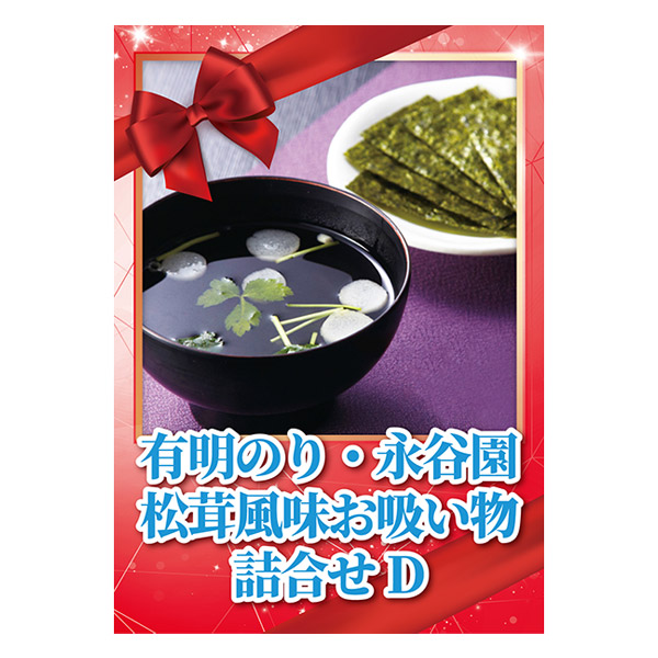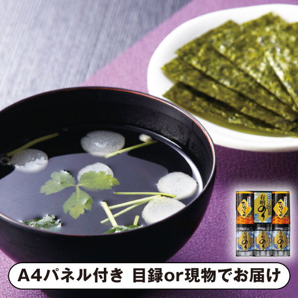 | 内容 | 有明海苔全型2.5枚(8切4枚×5)×3、永谷園松茸風味お吸い物(2.3g×4)×2 A4パネル×1 |