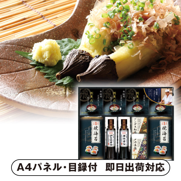 | 内容 | 鮨 紺乃 近藤賢一監修 あご入り割烹だしパック8g×4、鮨 紺乃 近藤賢一監修 飛騨高山(炒め物醤油・煮物醤油)200ml・瀬戸内藻塩50g・アンデス紅塩50g×各1、国産焼海苔(全型3枚)×2 A4パネル×1 |