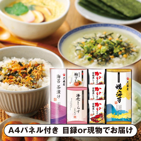 | 内容 | 焼海苔(8切8枚×2)・海苔茶漬け(5.4g×4)・海老しらすふりかけ(3g×3)・紀州梅干し(1粒×2)×各1、かに風味茶碗蒸しの素(2食分)×3 A4パネル×1 |