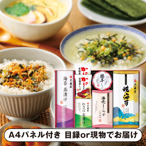 | 内容 | 焼海苔(8切8枚×2)・海苔茶漬け(5.4g×4)・わさび茶漬け(5.6g×2)・海老しらすふりかけ(3g×3)・紀州梅干し70g×各1、かに風味茶碗蒸しの素(2食分)×2 A4パネル×1 |