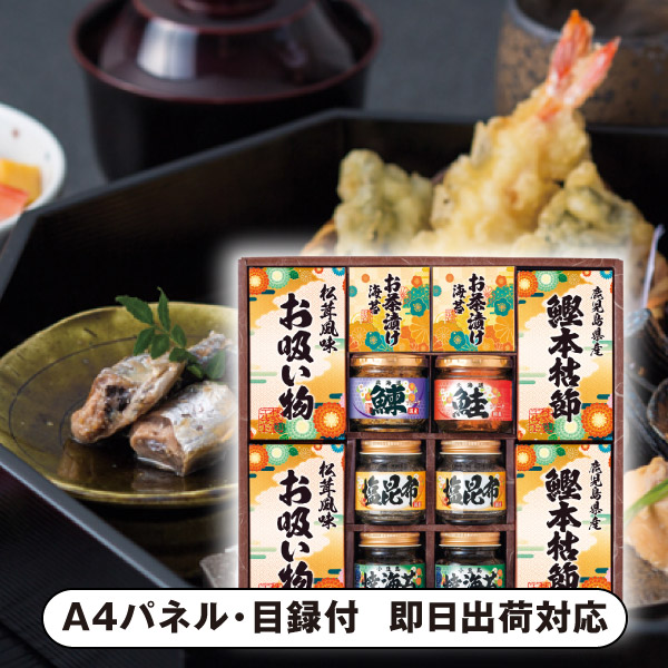 | 内容 | 焼きのり入佃煮85g・鰹本枯節(2.5g×3)・永谷園お茶づけ海苔(4.7g×2)・永谷園お吸い物松茸風味(2.3g×4)・塩昆布18g×各2、鮭フレーク40g・にしんフレーク50g×各1 A4パネル×1 |