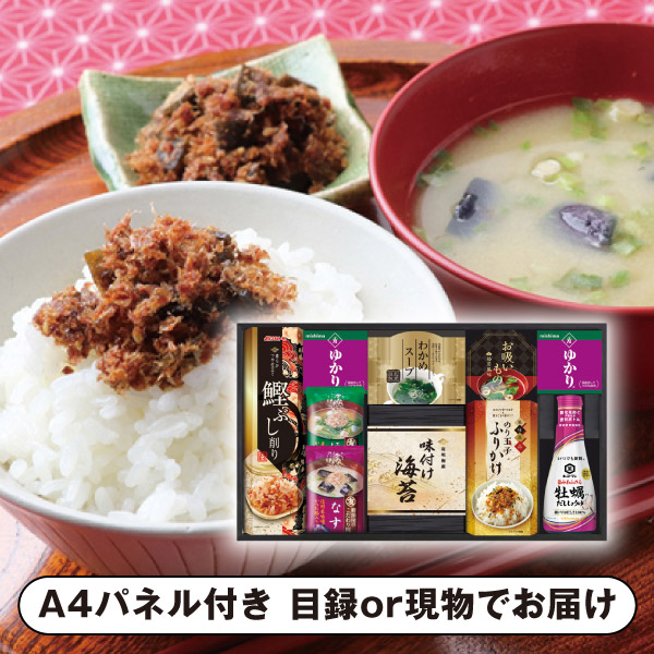 | 内容 | マルトモ即席みそ汁(ほうれん草7.5g・なす7.4g)・わかめスープ(5.3g×2)・マルトモ鰹ぶし削り(2g×3)・有明海産味付け海苔(8切6枚×2)・永谷園お吸いもの松茸風味(2.3g×2)・のり玉子ふりかけ(4.5g×2)・キッコーマン牡蠣だししょうゆ200ml×各1、三島食品スティックタイプゆかり(1.7g×4)×2 A4パネル×1 |