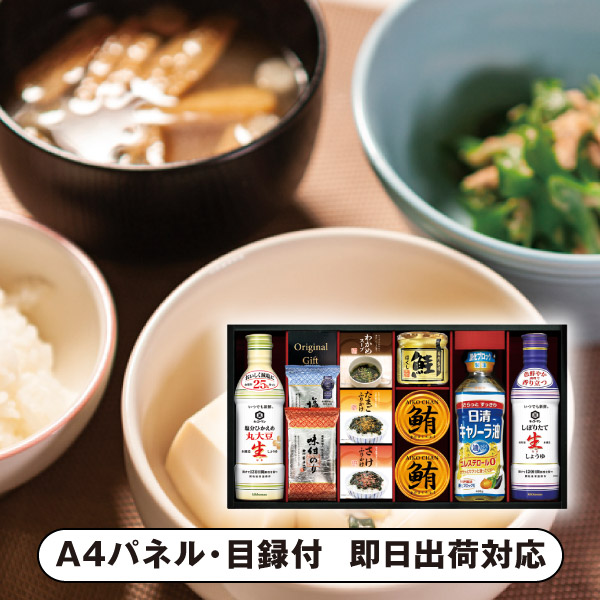 | 内容 | キッコーマン塩分ひかえめ丸大豆生しょうゆ450ml・キッコーマンしぼりたて生しょうゆ450ml・わかめスープ(3.8g×3)・丸美屋たまごふりかけ(2.5g×3)・丸美屋さけふりかけ(2.5g×3)・鮭ほぐし50g・味付のり(8切6枚)・有明海産塩のり(8切6枚)・日清キャノーラ油400g×各1、まぐろ油漬け70g×2 A4パネル×1 |