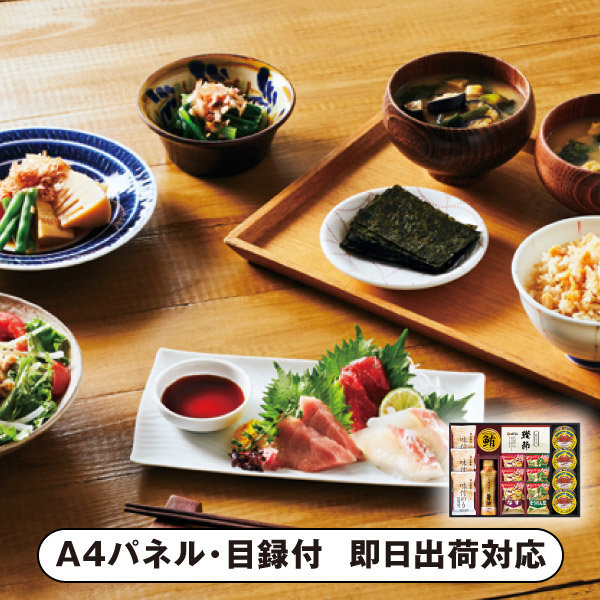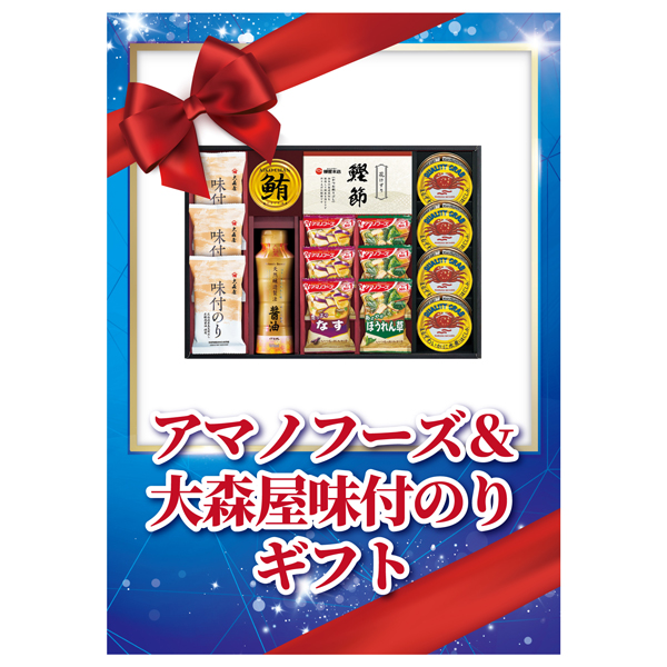 | 内容 | アマノフーズいつものおみそ汁(なす・ほうれん草)・大森屋味付のり(8切5枚)×各3、まるずわいがにほぐし身55g×4、天然醸造醤油200ml・柳屋本店かつおパック(3g×3)・鮪油漬フレーク70g×各1 A4パネル×1 |