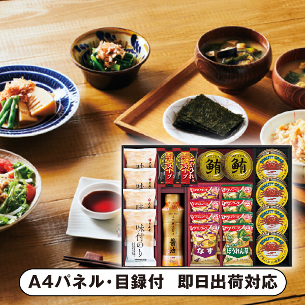 | 内容 | アマノフーズいつものおみそ汁(なす・ほうれん草)・大森屋味付のり(8切5枚)・まるずわいがにほぐし身55g×各4、鮪油漬けフレーク70g・ふかひれ風スープ×各2、天然醸造醤油200ml×各1 A4パネル×1 |