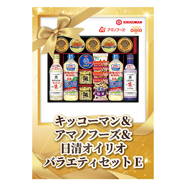 キッコーマンの生しょうゆ、アマノフーズや味付のりやお味噌汁、日清オイリオの油など、ごはんのおともを豊富に詰め合わせたバラエティギフト。健康を気遣う方への贈り物に最適です。