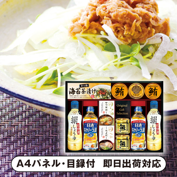 | 内容 | ヤマサ絹しょうゆ450ml・鮭ほぐし50g・日清キャノーラ油400g・まぐろ油漬け70g×各2、かね七かつおだし(4g×5)・かね七こんぶだし(4g×5)・海苔茶漬け(6g×5)・宝幸貝柱水煮ほぐし身65g(固形量35g)×各1 A4パネル×1 |