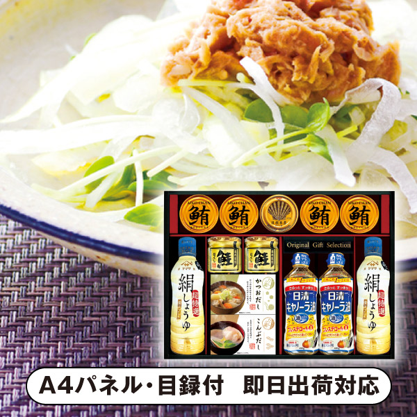 | 内容 | ヤマサ絹しょうゆ450ml・鮭ほぐし50g・日清キャノーラ油400g×各2、まぐろ油漬け70g×4、かね七かつおだし(4g×5)・かね七こんぶだし(4g×5)・宝幸貝柱水煮ほぐし身65g(固形量35g)×各1 A4パネル×1 |