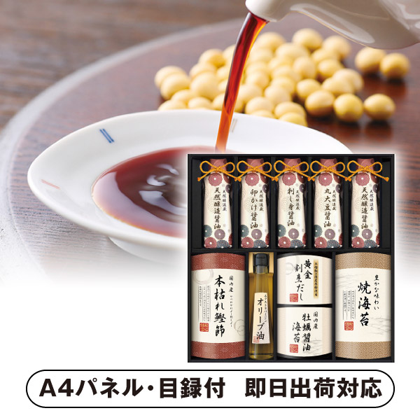 | 内容 | 国産焼き海苔(全型3枚入)・天然醸造蔵仕込み(卵かけ醤油・刺し身醤油・丸大豆醤油)200ml・牡蠣醤油海苔(8切6枚)・エクストラバージンオリーブオイル100g×各1、天然醸造蔵仕込み天然醸造醤油200ml×2、黄金割烹だしパック8g×4、本枯れ鰹節2g×3 A4パネル×1 |
