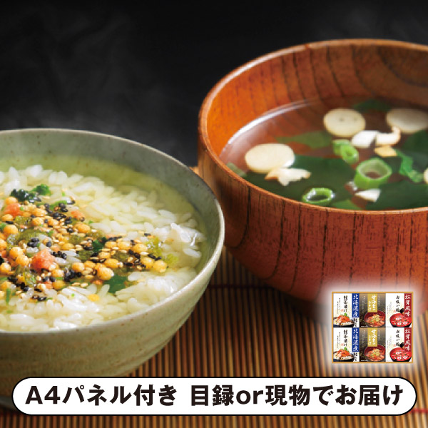 | 内容 | 甘海老みそ汁(7.5g×3)・北海道産鮭茶漬け(4g×3)・永谷園松茸風味お吸い物(2.3g×4)×各2 A4パネル×1 |